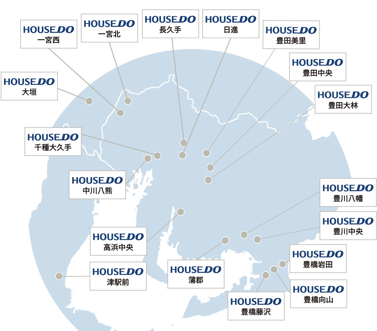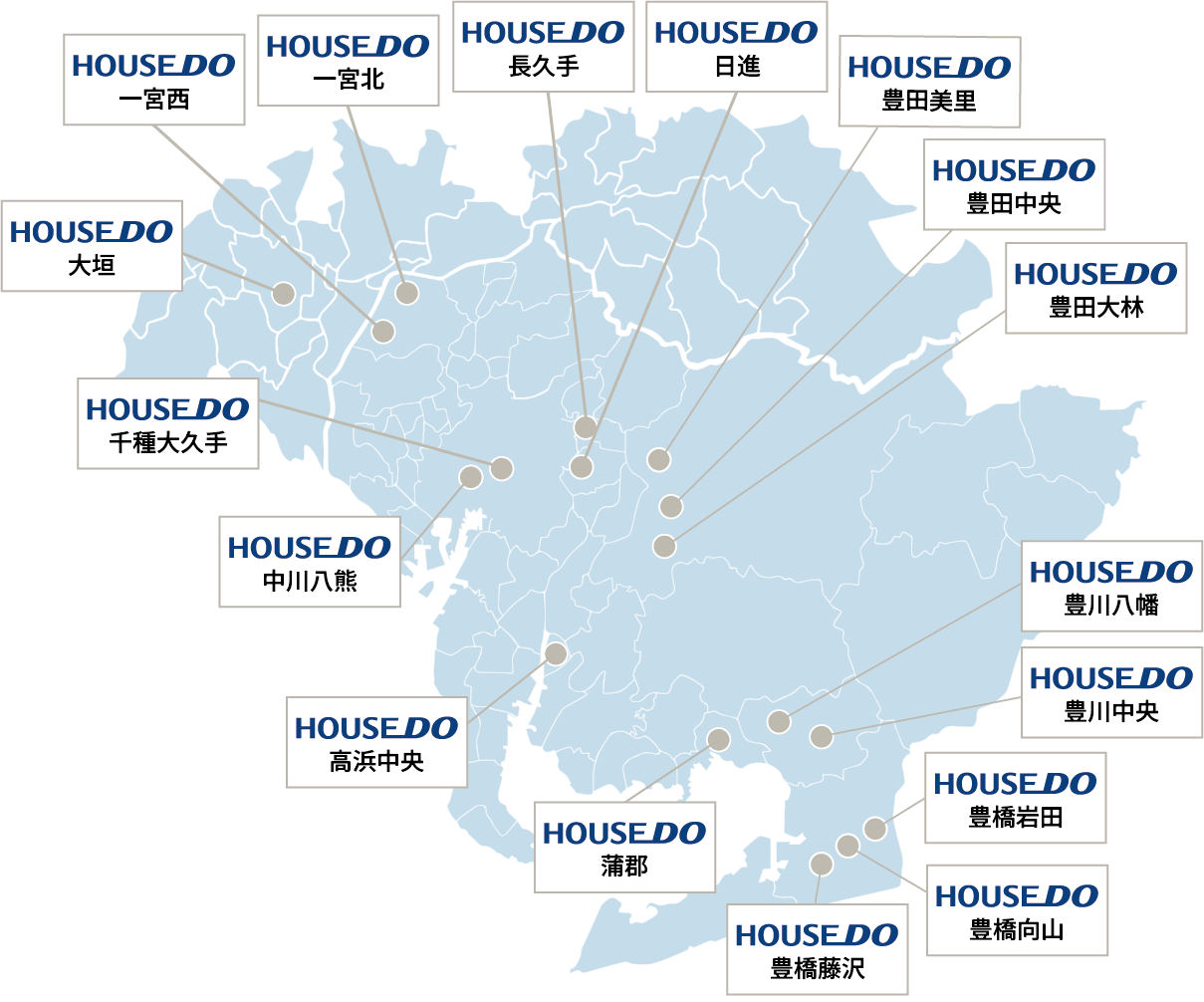 夢のおてつだいの運営する愛知県内岐阜県内ハウスドゥ16店舗の各地域密着営業と、